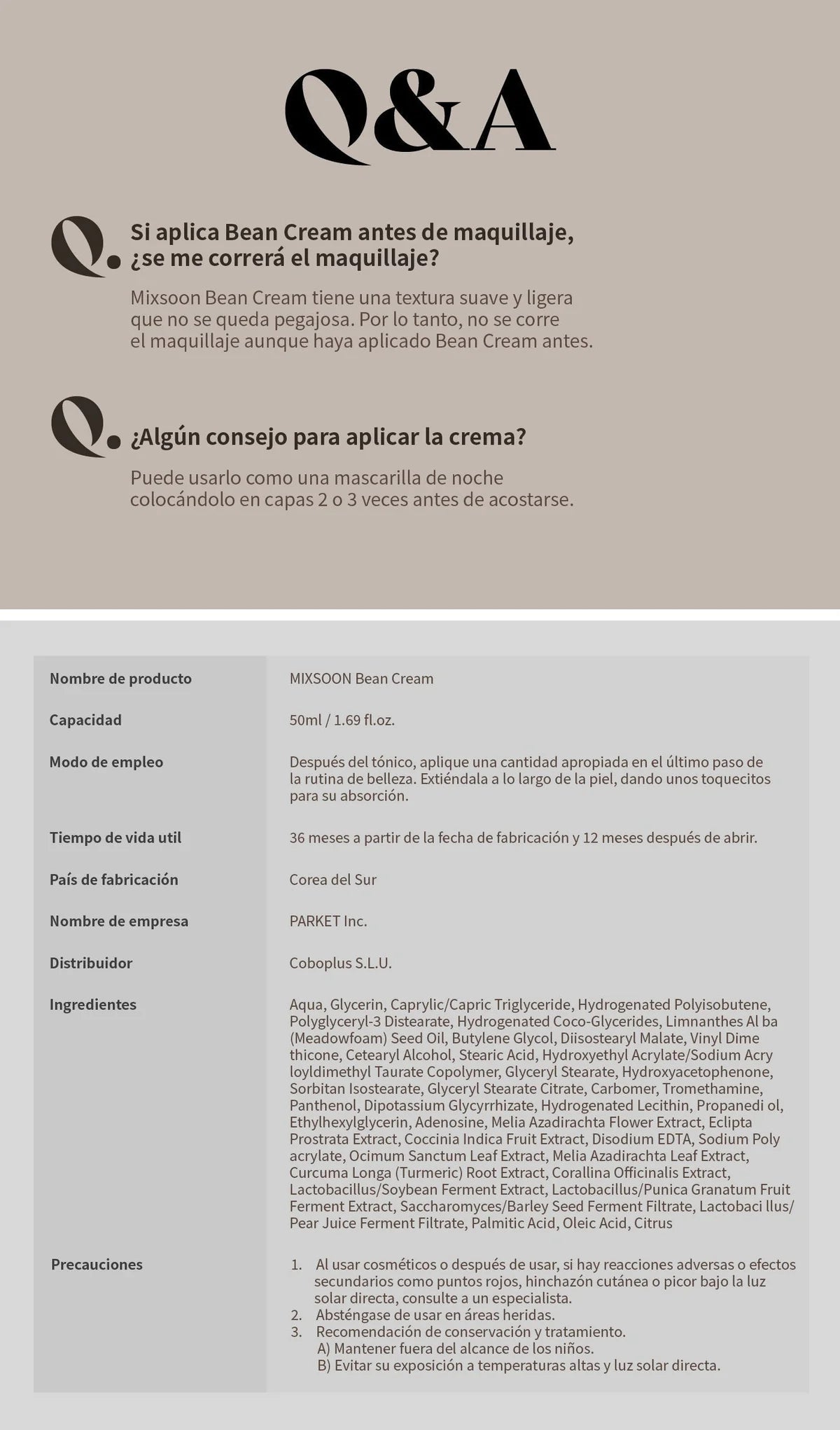 mixsoon bean cream es una crema hidratante formulada con extracto de soja fermentado altamente concentrado, conocido por su efecto estimulante del colágeno, aclarador de la piel y protector contra la radiación UV. Esta crema de rápida absorción también contiene aminoácidos esenciales derivados de la naturaleza que ofrecen un intenso cuidado de los poros al exfoliar suavemente y suavizar la textura irregular de la piel para lograr una tez más uniforme.