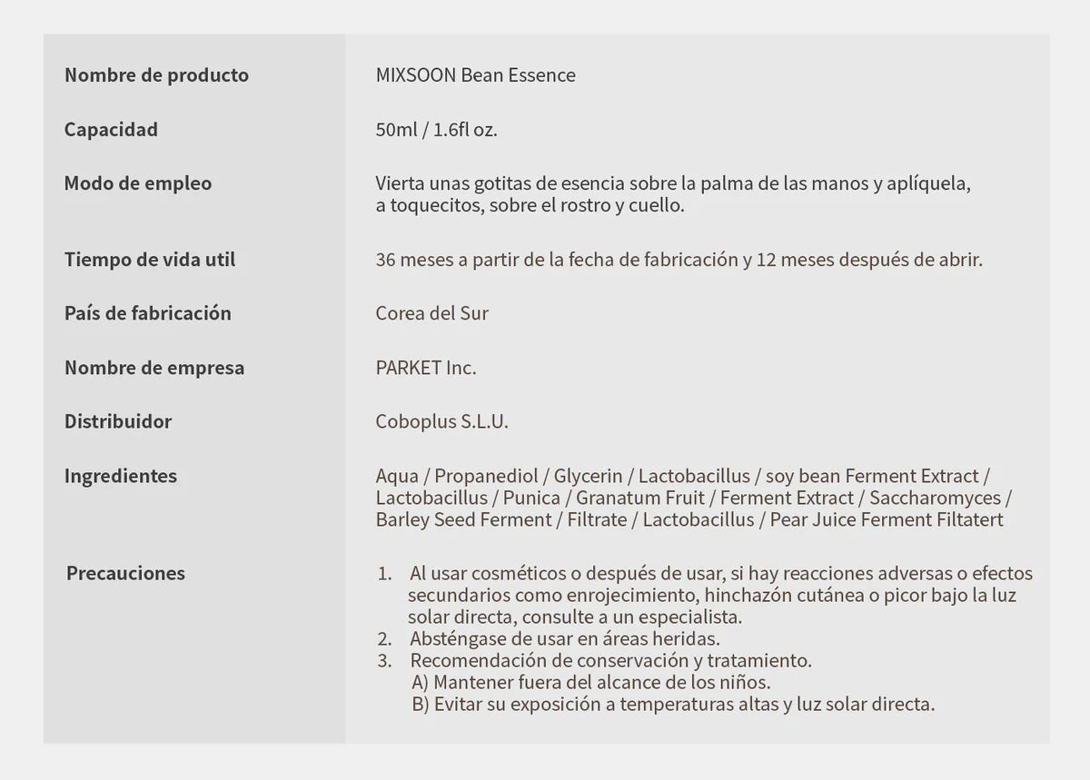 Descripción : El mixsoon Bean Essence es un producto hidratante y nutritivo para el cuidado de la piel, elaborado con soja fermentada, cebada, pera y granada. Además, tiene un efecto exfoliante suave que ayuda a quitar las células muertas de la piel y a quedarse con una piel más suave y radiante. Este producto contiene una gran cantidad de aminoácidos esenciales, vitaminas y ácidos alfa-hidróxidos naturales que mejoran la vitalidad y la textura de la piel.